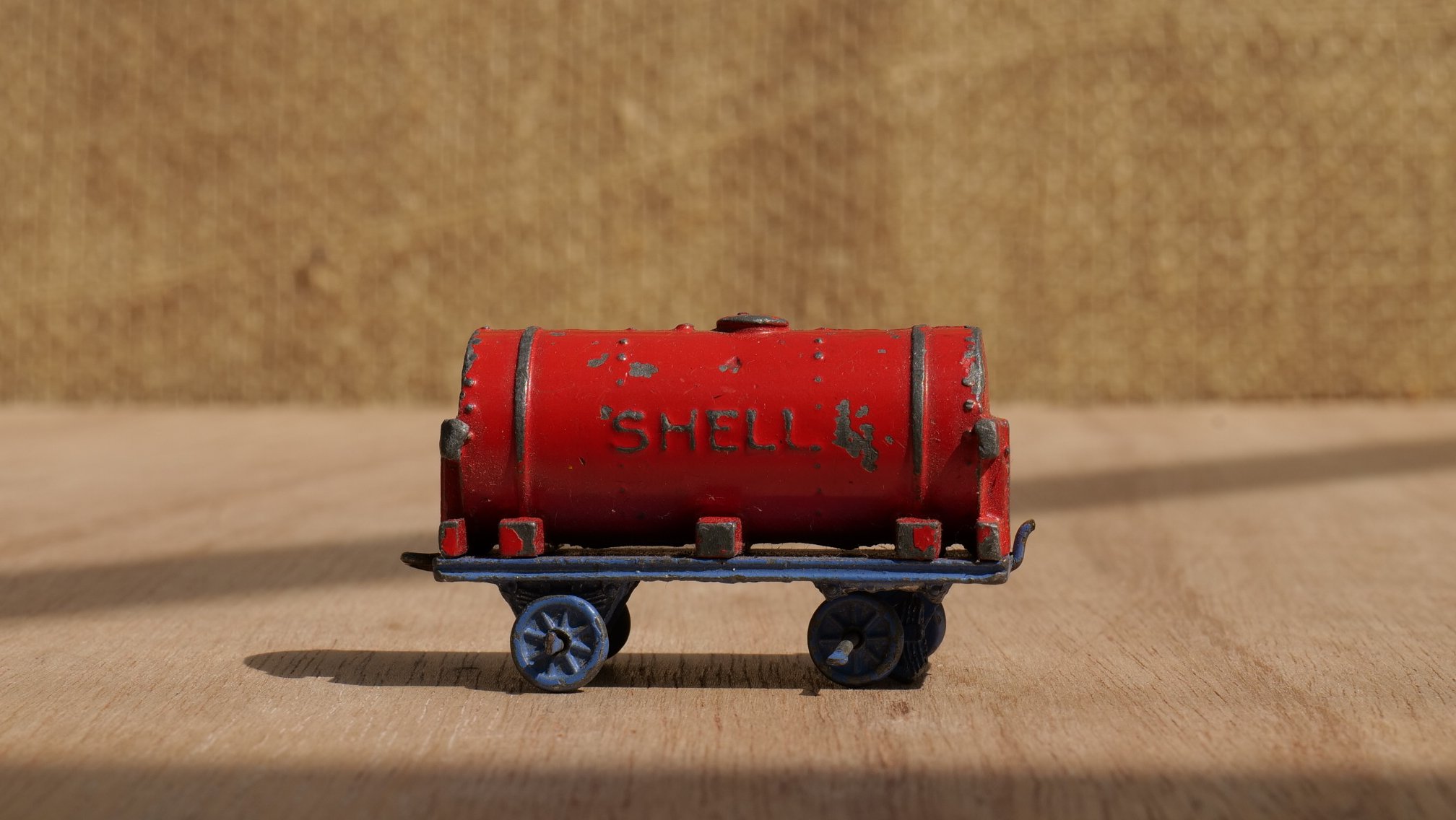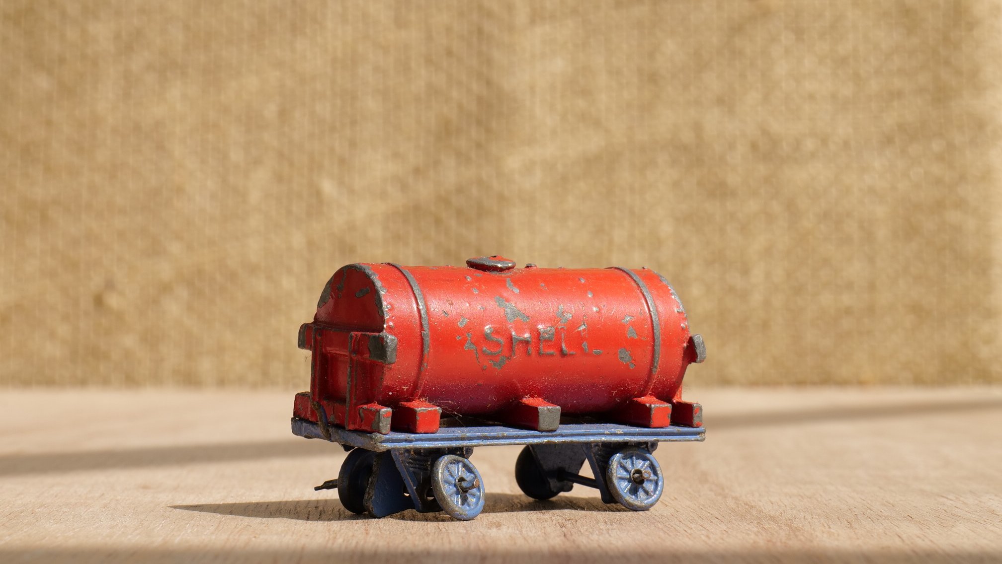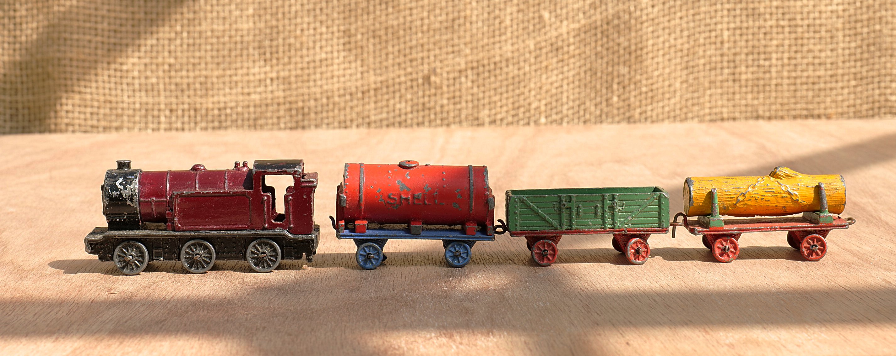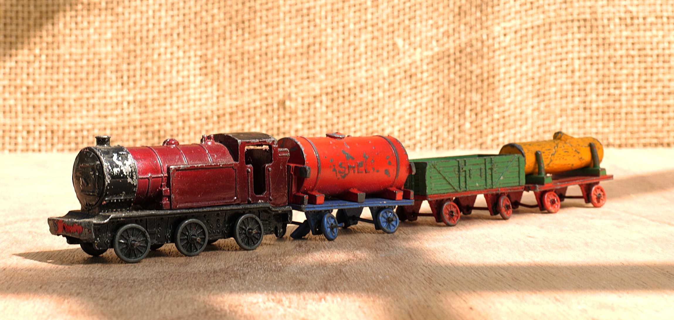 Remarks: This is a very rare find.   A die-cast (in lead) train set in play-worn condition with age-related patina.   The Locomotive is in 0-6-0 configuration and its model number, we believe, is 17a.   The Shell Petrol Tanker is a particularly sought-after model, number 21d, and finished in vibrant colours as is the The lumber wagon.   These were apparently produced between 1934 and 1941 and has the model number 21c.   We have been unable to find any information about the he low-sided wagon: though it is highly probable it was sold as part of the same set.