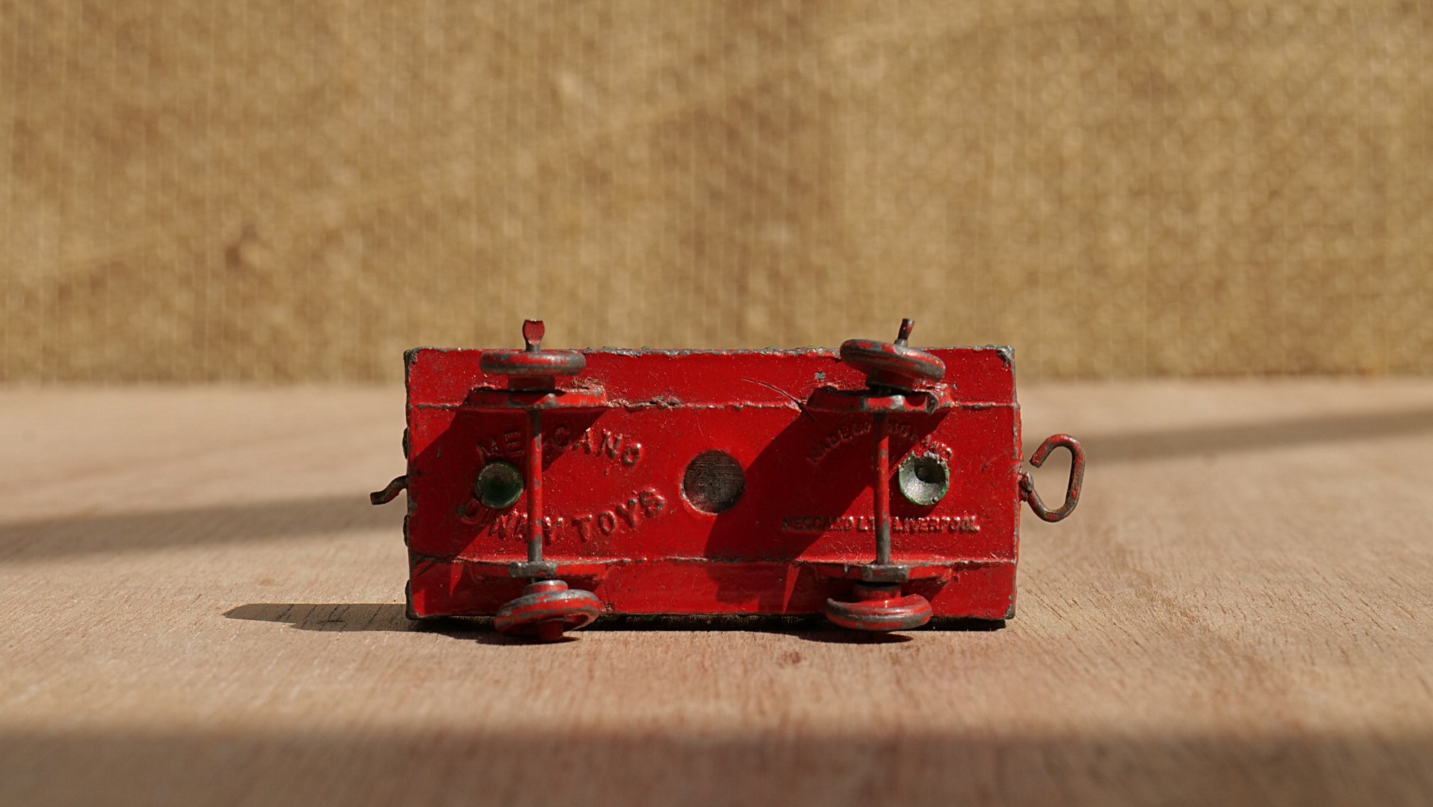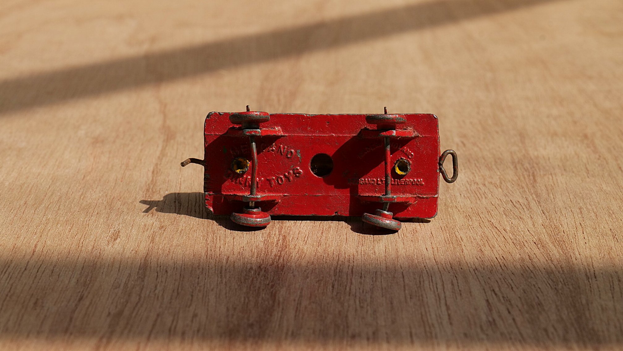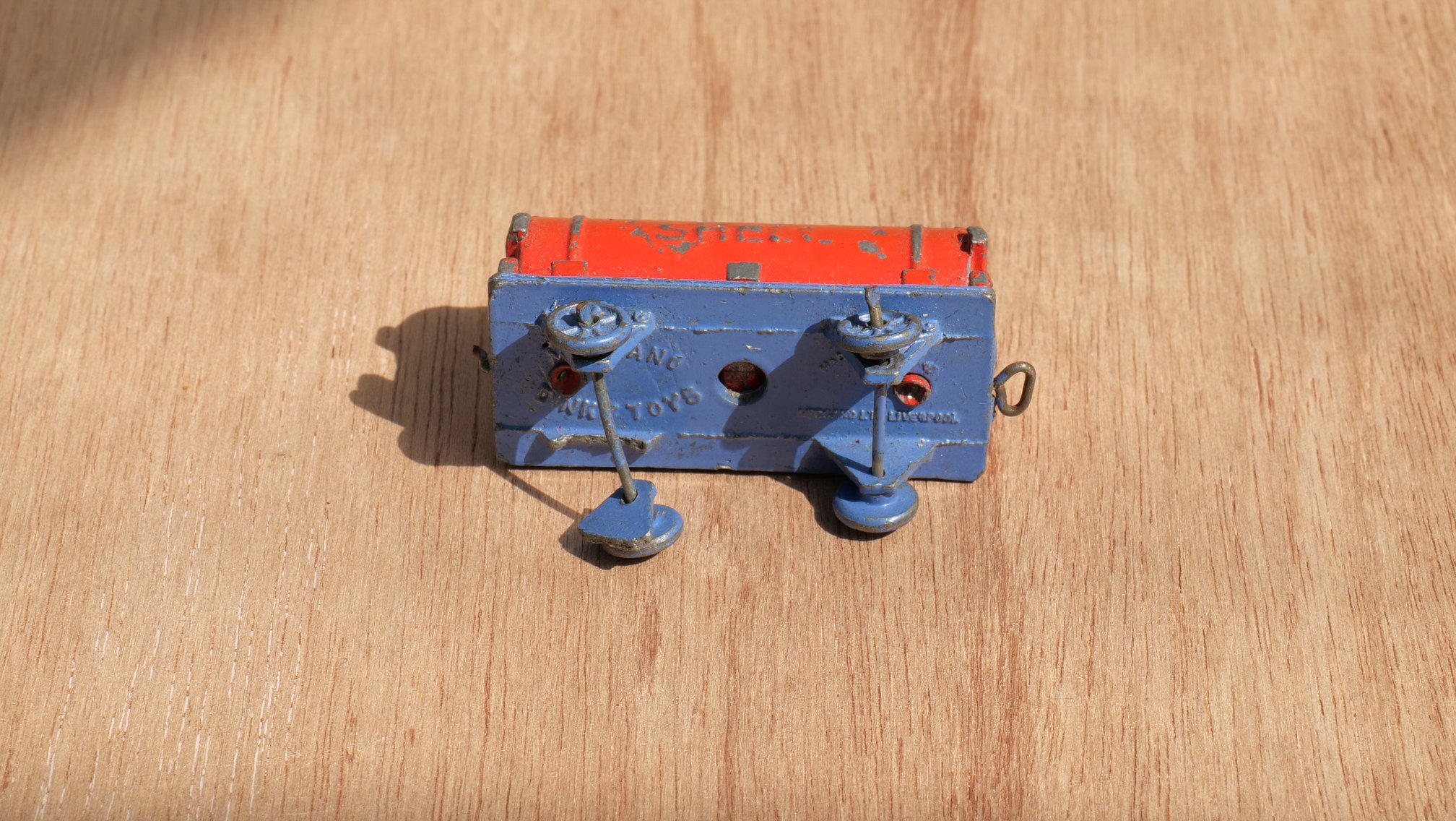 The cabin of the loco is not secure and seperates from the chassis if picked up by that part.   The bracket securing the wheel to the chassis on the petrol tanker has sheared off.   Both will be an easy fix for someone with the correct tools and know how.   This set was manufactured in England circa 1930s.   As far as we can ascertain, around 1934.